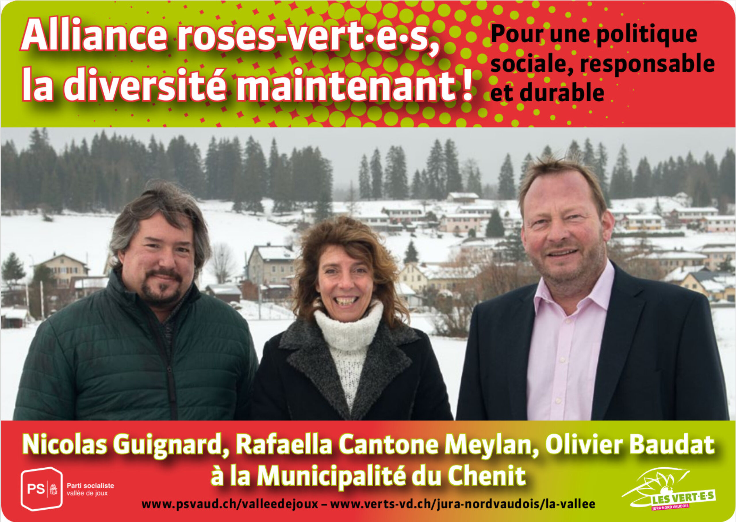 Les Vert·e·s présentent une liste commune « Alliance Rose-Vert.e.s » comptant 26 candidat-e-s avec le Parti Socialiste pour le Communal communal du Chenit.