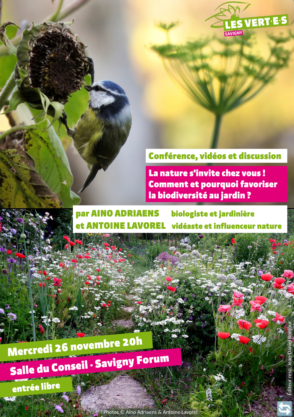 - 26 novembre 2025 à 20h : favoriser la biodiversité dans votre jardin, avec Aino Adriaens (biologiste) et Antoine Lavorel (influenceur nature)