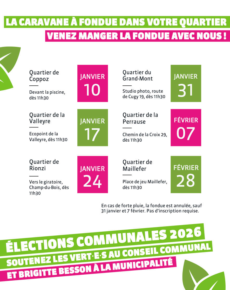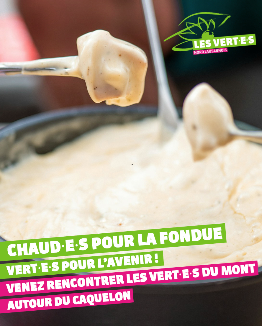 Venez partager une fourchette de pain au fromage et un verre de chasselas ou un thé avec les Vert·e·s du Mont lors de la caravane à fondue.